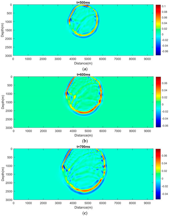 We choose the time step ms. The 2D acoustic wave propagation process is displayed at different times with t = 500 ms, 600 ms, 700 ms, and 800 ms in Figure 8, which has a good agreement with the acoustic velocity parameters of the Marmousi model. For example, we can observe visible reflections and weak dispersion at points where velocity changes rapidly. The forward algorithm is coded in MATLAB (R2023a), and the subroutine is given in Appendix A.