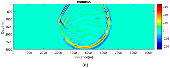 Snapshots of wavefields obtained by the hybrid CPS-FDTD algorithm for the Marmousi velocity model in Figure 7. (a) t = 500 ms, (b) t = 600 ms, (c) t = 700 ms and (d) t = 800 ms.
