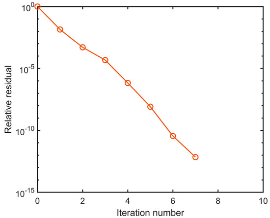 For the numerical simulations of the two-layer acoustic velocity model shown in Figure 3, the computer time is only 1.8 s in the ILU-BICGSTAB iterative method for the discrete elements of 100 × 100 in the space domain. Figure 10 shows the convergence curve and total number of the ILU-BICGSTAB iterative method, suggesting that the relative residual is reduced with the iteration number. The computational time is mainly consumed by the solution of Equation (29).