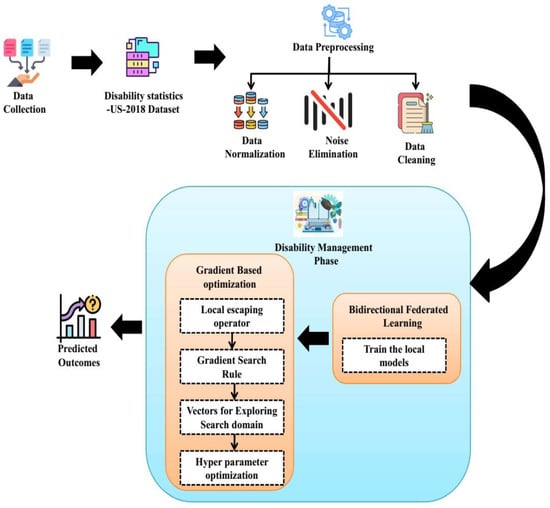 This paper proposes a novel method named the Bidirectional Federated-Learning-based Gradient Optimization (BFL-GO) algorithm to accurately predict diseases in the healthcare system. In this study, a gradient optimization algorithm was employed with Bi-LSTM with a federated learning method to enhance disability management. The Disability Statistics-United States-2018 dataset was given as the input to the developed model. Figure 1 shows the overall structure of the BFL-GO model. It contains 4 phases, namely data collection, data pre-processing, the disability management phase, and the predicted output.