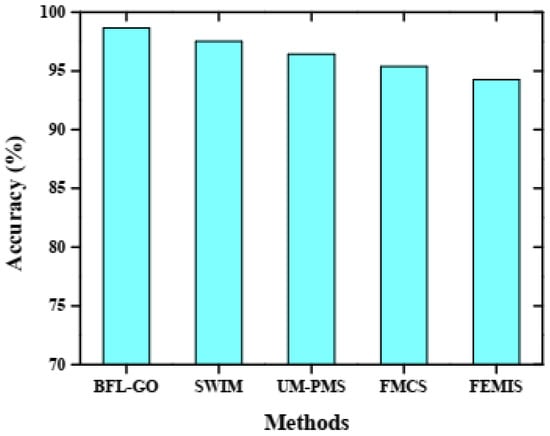 The performance analysis of the BFL-GO method for disability management in information systems using the specified performance metrics, namely specificity, F1-score, recall, precision, and accuracy, provides a comprehensive evaluation of its effectiveness []. The performance was evaluated by comparing the BFL-GO method with the existing methods such as SWIM, UM-PMS, FMCS, and FEMIS. Figure 3, Figure 4, Figure 5, Figure 6 and Figure 7 depicts the comparative graphical representation of the BFL-GO method and the existing methods for different evaluation metrics based on disability management in the information system.
