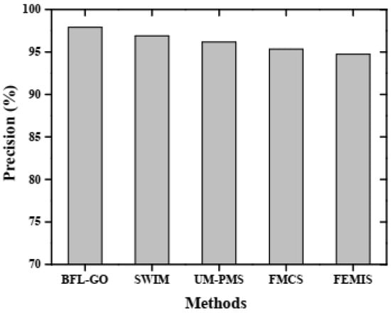 The accuracy of the BFL-GO method and the existing methods is demonstrated by the graphical analysis shown in Figure 3. The BFL-GO method achieved a high accuracy of 98.65%, while the existing methods such as SWIM, UM-PMS, FMCS, and FEMIS obtained low accuracies of 97.52%, 96.43%, 95.38%, and 94.26%, respectively. Figure 4 illustrates the graphical analysis depicting the precision of the BFL-GO method and the existing methods. The BFL-GO method achieved a high precision of 97.91% while the existing methods such as SWIM, UM-PMS, FMCS, and FEMIS obtained low precisions of 96.89%, 96.17%, 95.34%, and 94.73%, respectively.