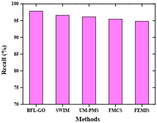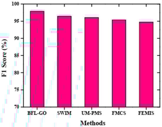 In Figure 5, the recall of the BFL-GO method and the existing methods is illustrated by the graphical analysis. The BFL-GO method achieved a high recall of 97.82% while the existing methods such as SWIM, UM-PMS, FMCS, and FEMIS obtained the low recalls of 96.58%, 96.13%, 95.41%, and 94.79%, respectively. Figure 6 represents a graphical analysis illustrating the F1-score of the BFL-GO method and the existing methods. The BFL-GO method attained a high F1-score of 97.86% while the existing methods such as SWIM, UM-PMS, FMCS, and FEMIS obtained low F1-scores of 96.42%, 96.07%, 95.34%, and 94.73%, respectively.