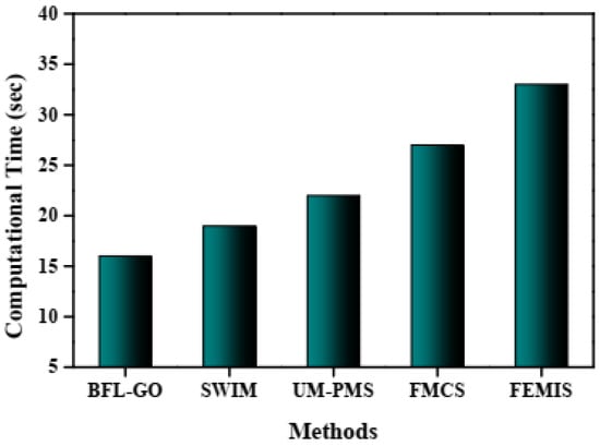In Figure 8, the AUC-ROC of the BFL-GO method and the existing methods are illustrated by the graphical analysis. The BFL-GO method achieved a high AUC-ROC of 0.9812 while the existing methods such as SWIM, UM-PMS, FMCS, and FEMIS obtained low AUC-ROCs of 0.9721, 0.9632, 0.9574 and 0.9526, respectively. Figure 9 represents the graphical analysis illustrating the computational time of the BFL-GO method and the existing methods. The BFL-GO method achieved a low computation time of 16 s, while the existing methods such as SWIM, UM-PMS, FMCS, and FEMIS obtained high computation times of 19 s, 22 s, 27 s, and 33 s, respectively.