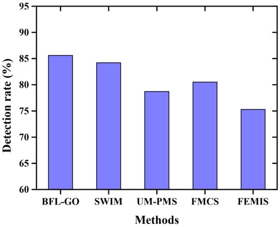 Figure 10 depicts the validation of detection rate. The evaluation determines the ratio of true positive values from the obtained samples. The accurate information was determined by validating with test cases. The evaluation was performed with the proposed BFL-GO and existing SWIM, UM-PMS, FMCS as well as FEMIS techniques. Compared to existing methods, the method proposed attained a better performance by attaining the value of 85.6%.