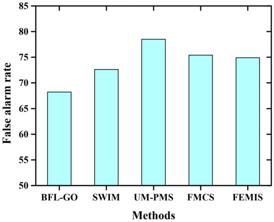 The false rate analysis for the proposed and existing methods is delineated in Figure 11. It is highly utilized to detect the faults of information systems in real-world applications. The proposed model’s superior performance is evidenced by its lower results. In this validation, the achieved range of existing methods were 72.6%, 78.5%, 75.4%, and 74.9%, respectively. Meanwhile, the proposed method minimized the false rate at 68.2% and had enhanced performance.