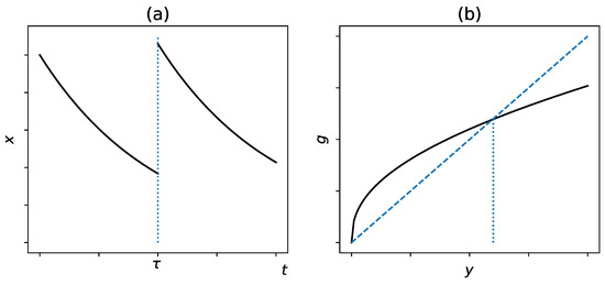 where , is a population productivity parameter, and k is the biomass of competitors. From now on, we assume that all delta functions δ are T-periodic. Roughly speaking, the solution of (3) on is a decreasing exponent, except of one point , where there is a positive jump from to , see Figure 1a.
