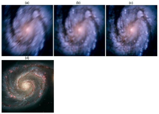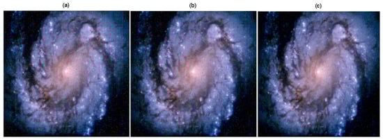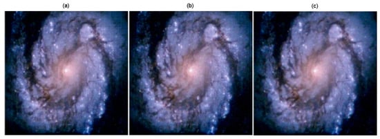 This work develops the so-called “spectral method” for determining the type and parameters of image distortions, and then certain parameters are used to eliminate image distortions by solving the IE (see below). Figure 3 demonstrates three photographs (images) of 512 × 511 × 3 px of the galaxy M100 (NGC 4321) with different point spread functions (PSFs).