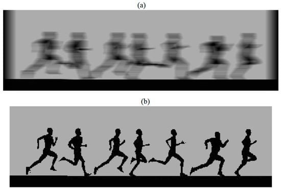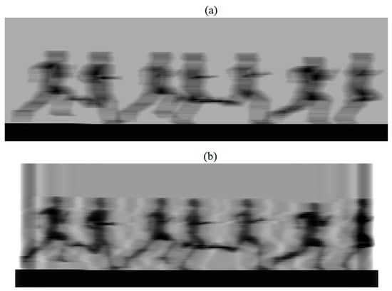 The result of processing a smeared image of runners. (a) Image g 123 × 400 px with strong smear; (b) reconstructed image w 123 × 380 using inverse filtering with the Gibbs effect.