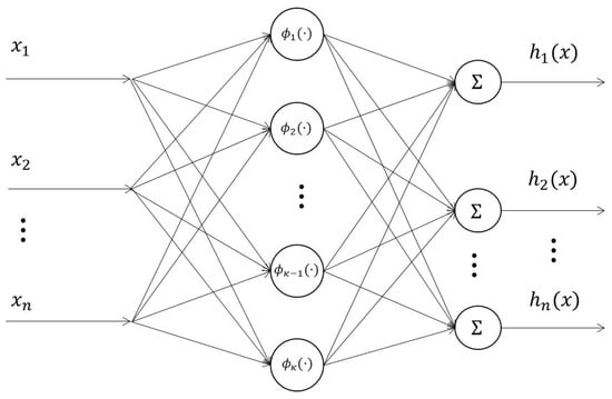 where represents the receptive field of the center, is the input of the RBFNNs, is the width of Gaussian function. Figure 1 shows the structure of the RBFNNs, and , , , , represent the input layer, neuron layer and output layer, respectively.