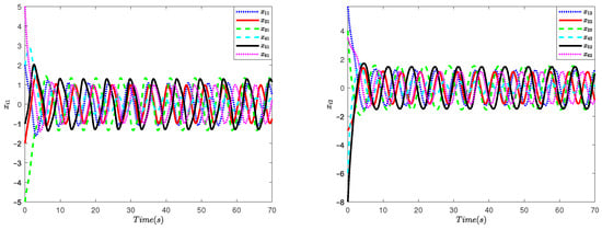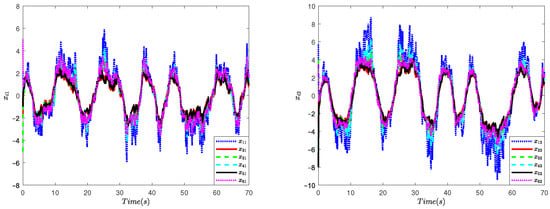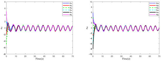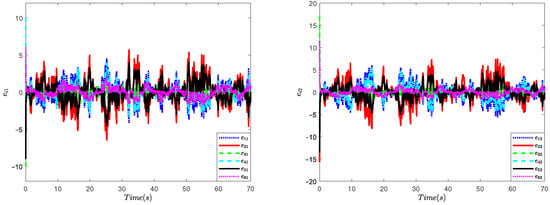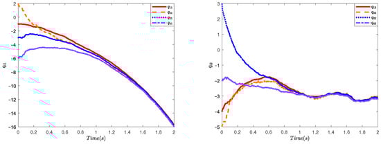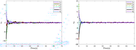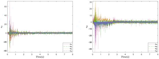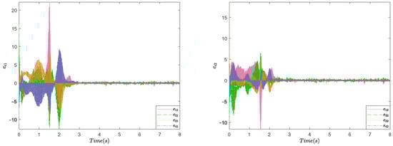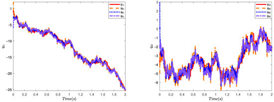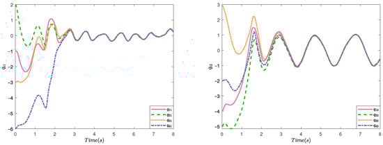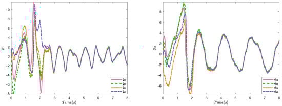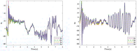 Figure 11, Figure 12 and Figure 13 show the trajectories of and when and Figure 14, Figure 15 and Figure 16 show the trajectories of and when , obviously, the multi-manipulator system has a more stable performance with a minor k.