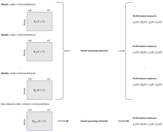 - Next, the closed queueing network approach, specifically the above algorithm (one for each simulation), is used to fit the data (see Figure 1). In this way, the performance measures of each of the models are obtained in terms of , with :