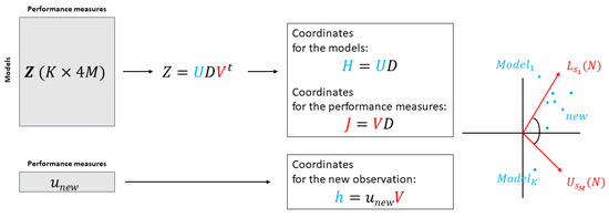 Figure 3. Computation of the performance measures for the new dataset. - Finally, the coordinates of this new observation are computed on the same HJ-Biplot graph. Since we have the matrices U, D, and V from the SVD of containing information from all our original models, we can project the new observation onto the same graph as . In this projection, we only take into account the first two columns in V (see Figure 4).
