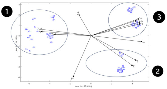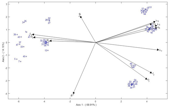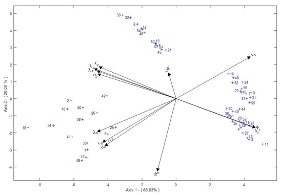 HJ-Biplot is a powerful tool for visualizing relationships among variables. Actually, the biplot graph displays the relationships among the observations and the variables, can be used to identify patterns and groupings among them, and can be used to explore the underlying structure of the data as follows [31]: