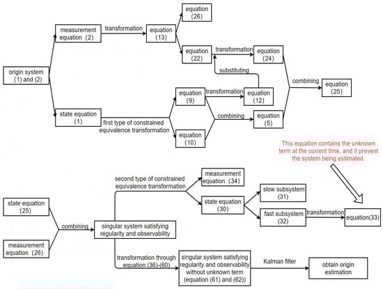 In Section 3.2, after performing a constrained equivalence transformation on the system, we obtained a system composed of Equations (3) and (13). Then, we combined a part of the observation equation with the state equation and performed a second constrained equivalence transformation, resulting in a system composed of Equations (31), (33) and (34). In this chapter, we will transform the system into a known system by a series of transformations that eliminate the unknown terms.