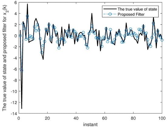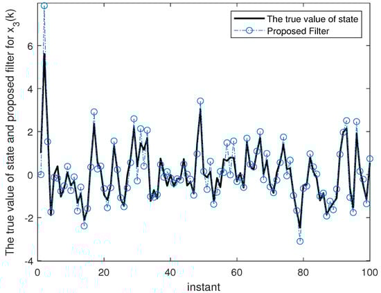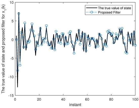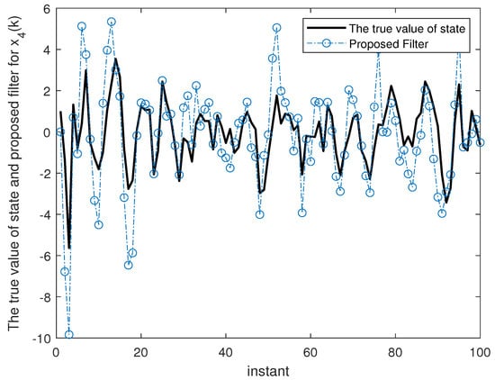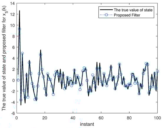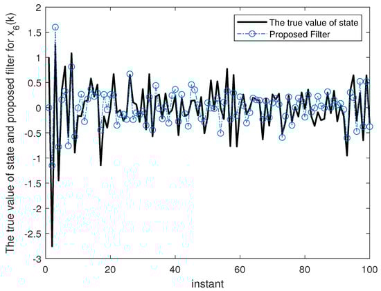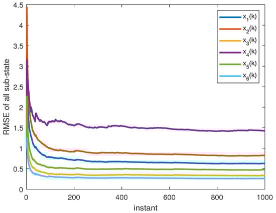 Figure 2, Figure 3, Figure 4, Figure 5, Figure 6 and Figure 7 show the proposed filtering results for six sub-states with 100 steps. Figure 8 show the root mean square error (RMSE) results using 1000 steps. From Figure 2, Figure 3, Figure 4, Figure 5, Figure 6 and Figure 7, we can see that each component of state estimation can effectively follow the true state component. From Figure 8, we can see that each component of state estimation tends to converge.