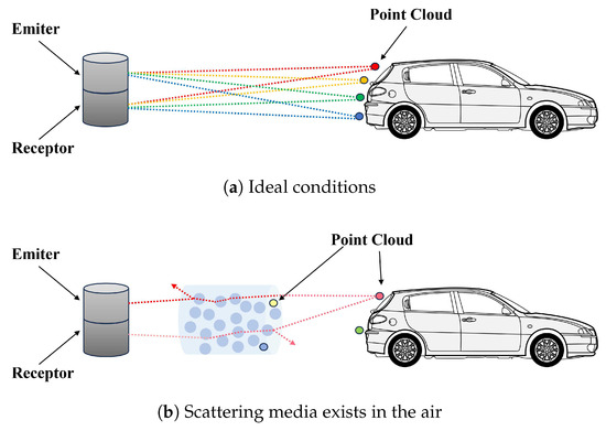 LIDAR perception. (a) Under ideal conditions, LIDAR pulse do not experience scattering and intensity attenuation upon reaching the target. (b) When there are scattering media in the air, the LIDAR pulse is scattered, resulting in a attenuation in the target’s reflection intensity. It may even incorrectly identify scattering particles as targets.