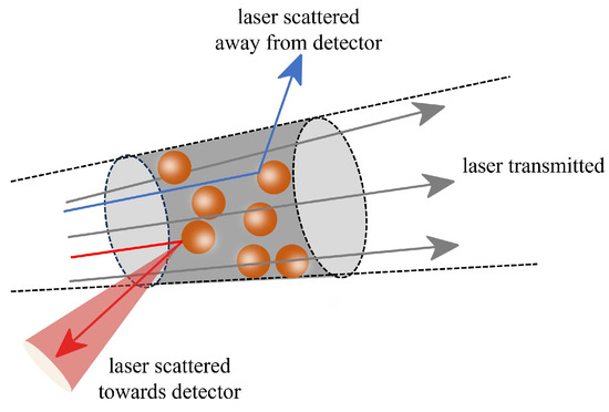 In the presence of scattering particles in the air, a fraction of the emitted pulse will be scattered, with some of the scattered pulses diverging away from the detector, some converging towards the detector, and a fraction of the emitted pulse penetrating through the scattering particles.