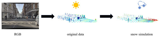 The data collection procedure of LIDAR point clouds under adverse weather conditions is time-consuming, labor-intensive, and highly risky, although some progress has been made along this line, including LIBRE [12], Seeing Through Fog [13], CADC [14], WADS [15], ACDC [16], Boreas [17], and so on. The lack of a large amount of high-quality training data in adverse weather impairs the reliability of deep learning-based object detectors. Physical simulation provides an effective tool of data augmentation for transforming and expanding original dataset in clear weather to adverse weather [18]. The breakthrough in this field can be seen in the contributions of [7,19,20,21], which create synthetic LIDAR point cloud datasets in fog, snowfall, and rain with physical simulations (Figure 3).