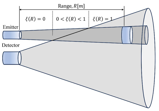 where P is the power received by the LIDAR sensor; is the system constant, which is related to light speed, the laser detector’s optical aperture area, and the overall system efficiency; and is reflectivity of the object. It is noteworthy that the time origin is set to and the peak value is attained at . in (3) is a crossover function, standing for the ratio of the area illuminated by the LIDAR transmitter () to the area observed by the receiver () (Figure 4),
