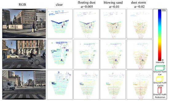In Figure 5, we conducted a comparative analysis between the simulated data under different dusty weather conditions (floating dust, blowing sand, and dust storm) and the original data captured on clear weather. Compared to the original point cloud data, in our simulated data, the points in the distance become sparser, and a growing number of “clutter points” appear in the area close to sensors; overall, the point cloud color tends to shift towards red. These changes suggest that an increasing number of original target points are being mistakenly identified by LIDAR, primarily manifested in forward shifts in position and the attenuation of reflection intensity. As shown in Figure 5, the outlines of pedestrians slightly farther away become increasingly unclear; the cyclist towards the rear virtually disappears in the dust storm scene; and there is a noticeable decline in the reflected signal intensity of the cars, making it impossible to discern their contours in the dust storm weather. The occurrence of this phenomenon is attributed to the increase in the quantity and size of sand dust particles in the air, which leads to a higher level of occlusion to the targets. The larger the extinction coefficient, the more significant the attenuation impact on the pulse intensity of the LIDAR. This ultimately leads to a reduction in the measurement range of the LIDAR.