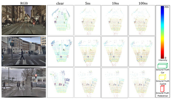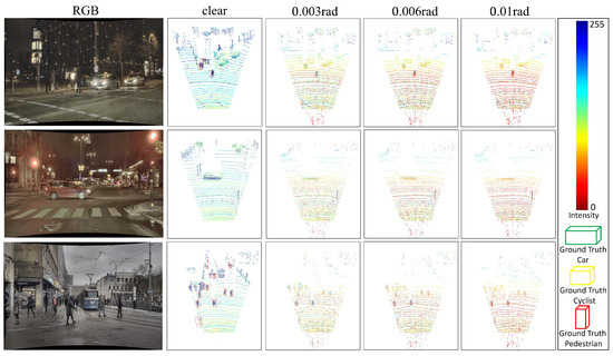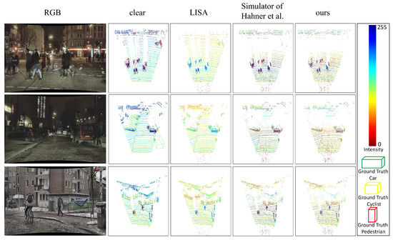 We listed these models in descending order based on their performance. Each model predicts three classes of objects (car, pedestrian, cyclist). Our simulation algorithm exhibited improvements across all models and all three classes of objects. Particularly noteworthy is the significant enhancement for PV-RCNN [36], which showed an increase of 10.23% in mean average precision (mAP) over those three classes compared to the clear-sky baseline. In comparison, PointRCNN [37] also demonstrated some performance improvement, albeit with a small growth rate of only 1.72%. The performance improvement observed in PV-RCNN may stem from its higher sensitivity to our simulated data, allowing it to better learn the features of the objects and improve the model’s generalization capability.