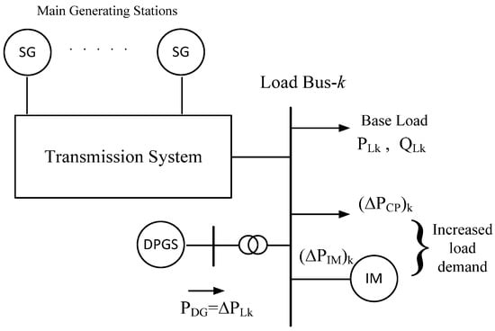 In the model of Figure 1, PLk and QLk are the base real and reactive power demand at load bus k. If ΔPLk is the increase in the load real power at bus k, then the real power generation of the interfaced DPGS is set as PDG = ΔPLk.