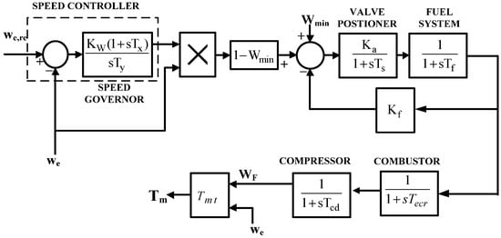 The main dynamic component of the MTGS is the compressor turbine modeled by a first-order transfer function with time constant Tcd. Due to the associated compressor discharge volume, the compressor output cannot respond instantaneously to any changes in its input. The combustor time constant Tecr is a small value related to the combustion reaction. The fuel system comprises a valve positioner and an actuator; the inertia of both governs the dynamics of the entire fuel flow mechanism. In the MTGS model of Figure 3, Wmin is the minimum fuel flow, whereas Kf and Ka are the fuel system feedback and gain of valve positioner, respectively. The mechanical torque output of the turbine is expressed by a function Tmt and is given by: