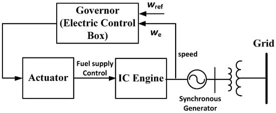 A DTGS comprises a synchronous generator driven by a diesel turbine prime mover; the general block diagram of the DTGS model is shown in Figure 4 and consists of an electric control box, actuator, and IC engine.