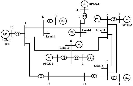 In [16], the authors examined the influence of a synchronous generator interfaced with a small hydropower-generating source of a Brazilian power grid by analyzing the stability aspects of the system. The study unveiled an improved voltage stability margin and transfer capacity due to increased power-generating source levels. A corresponding investigation involving synchronous-generator-based-power-generating sources in the distribution network is carried out in [17]. A technique based on projective integration is applied for rapidly simulating transient stability, particularly in the presence of the high penetration of distributed-power-generating sources and virtual synchronous generators [18]. Few other researchers [19] have emphasized the study of synchronous and asynchronous generator-based distributed-power-generating source technology. The study focuses on the distinct characteristics of these technologies and their impact on the stability of the power grid. The authors in [20] simulated various fault conditions to demonstrate the effect of DPGSs on transmission system transient stability. The study analyzed different fault scenarios occurring in multiple branches of the system, considering N-1 security to assess the system’s robustness.