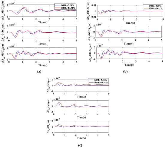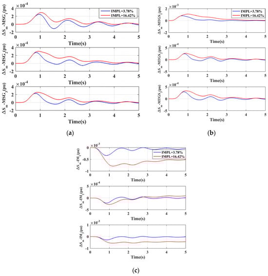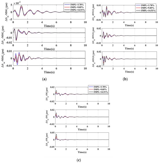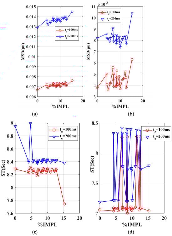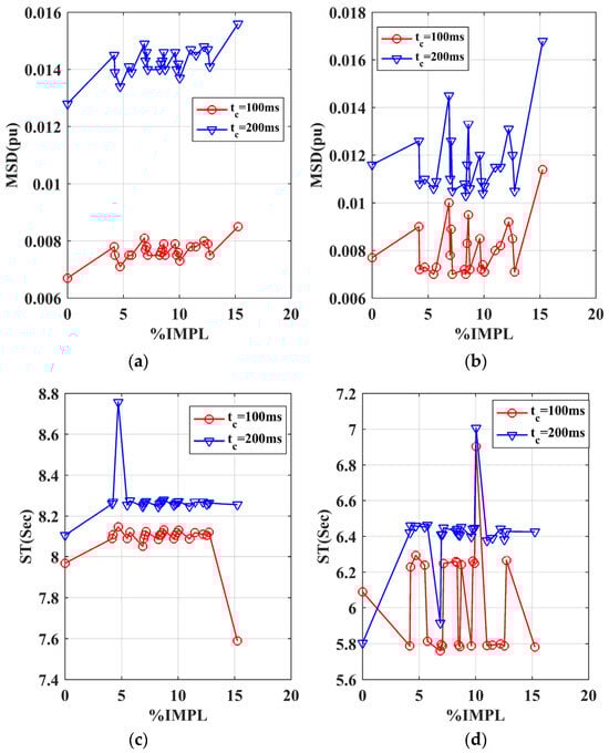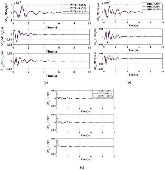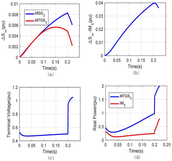 It is seen from Figure 16a that, soon after the fault application at t = 0, both MSG2 and MTGS3 accelerate, increasing the stator frequency of IM3. Since the terminal voltage of IM3 (bus 9) decreases significantly during the fault period, as observed from Figure 16c, the real power drawn by IM3 and the real power generated by the synchronous generator interfaced to MTGS3 decrease accordingly. This is shown in Figure 16d. This results in increased synchronizing power and the action helps to slow down the accelerating MTGS3-interfaced synchronous generator. It can be observed from Figure 16a that, at around 0.1 s, the slip deviation of MTGS3 starts reducing. Hence, if the location of the IM is nearer to the synchronous generators, it helps slow down the accelerating synchronous generators due to the neutralizing effect. This observation agrees with the findings by Davood Khani et al. [49]. However, at higher IMPL values, the induction motors affect the performance of other synchronous generators as the IM draws heavy reactive power from the system, causing voltage problems [21]. Therefore, it is necessary to employ reactive power compensation at IM terminals. It is worth noting here that, in [21,22], the DPGS does not directly supply the IM loads, whereas, in our study, the influence of the IM on stability is investigated when the DPGS directly supplies power to both the IM and CP loads.