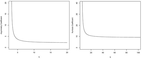 Figure 3 shows that when parameter q approaches 3, the asymmetric coefficient tends to infinity. In the same way, when parameter q approaches 4, the kurtosis coefficient tends to infinity. We can observe that as and as . The notation ∼ indicates that it is asymptotically equivalent. This shows the flexibility of the SME distribution in the asymmetry and kurtosis coefficients.