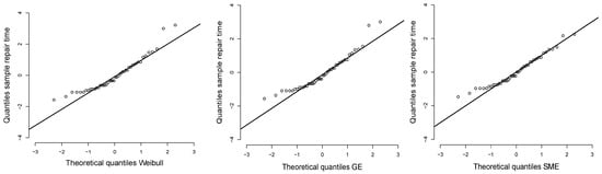 Figure 5 shows that the theoretical quantiles of the proposed SME model present a better fit to the quantiles of the repair time data of the sample than the theoretical quantiles of the Weibull and GE models. Thus, as stated above, based on the AIC and BIC selection criteria, the SME model presents a better fit with this dataset.