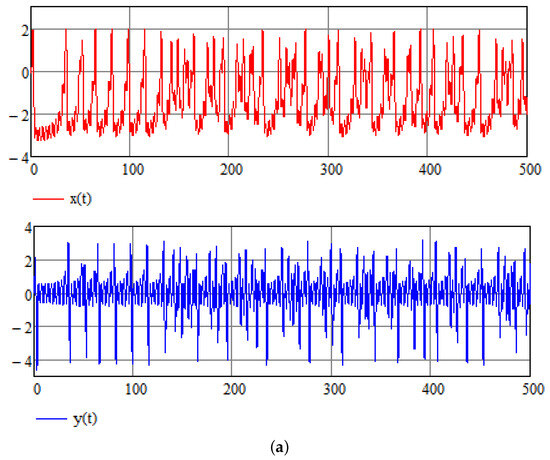 Chaotic reactions of the cardiac system may be related to abnormal physiological functioning such as ventricular fibrillation, which is one of the most dangerous cardiac arrhythmias [25,26]. Various parameters are supposed to represent this type of pathology. In accordance with [8], the following parameters are assumed: , and . The chaotic reaction can be seen in Figure 1a,b that show time history and phase space for the initial condition . As for the numerical method, the program Mathcad is used, which relies on the standard Runge–Kutta method. The RK4 method used is a fourth-order method, meaning that the local truncation error is of the order of while the total accumulated error is of the order of .