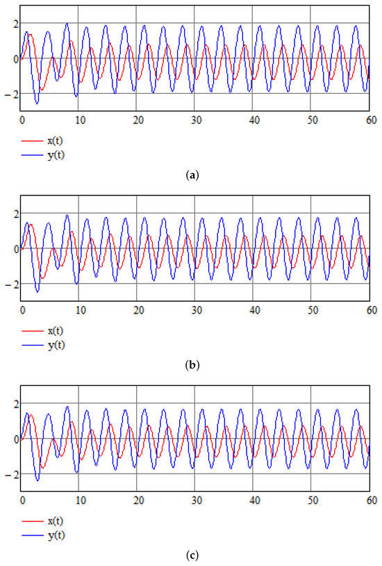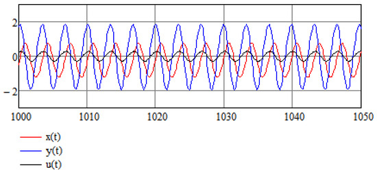 Below, we represent the results of stabilization of chaotic System (16). By stabilization we mean that system variables change periodically in an orderly oscillatory fashion and do not behave chaotically (this does not mean that any of the variables approach zero for long enough durations). Stabilization was achieved by the method based on the integro-differential equations technique presented above. Parameters of the system are as described in the previous section. The solution of this set of equation is performed over time interval 10,000. Initial conditions . and are given in Figure 2 for the first sixty time units, showing how quickly the system is stabilized. We use three different values of and : in Figure 2a, in Figure 2b, and in Figure 2c, showing that the choice of the stabilizing parameters is not unique and stabilization occurs provided that Equation (24) is satisfied. The solution of this set of equations is performed over time interval . Figure 3 shows the parametric plot of and an ellipse-like plot obtained for a time interval , which attests to the stability of the system even after a long time interval. Figure 4 compares control function to original signals and showing how minute the intervention is that is required to achieve stability (which may have life-saving effects).