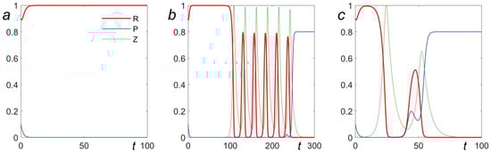 Dynamics in homogeneous case, , : (a) , (b) , (c) .