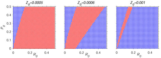 To estimate the impact of phytophage on the success of biocontrol, we carried out computations on realization of two scenarios: elimination of weeds (equilibrium , ) and downfall of cultivated plant (equilibrium , ). The structure of equilibrium basins (areas of attraction) was constructed numerically and shown in Figure 2. We performed the calculations for different starting densities of weed and cultivated plant for three initial densities of the phytophage population . After reaching equilibrium, the starting point was marked with either red (weed’s victory, equilibrium , ) or blue (domination of cultivated plant, equilibrium , ).