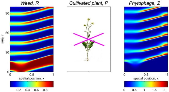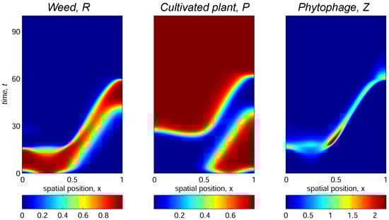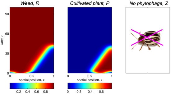 where , , and are the initial abundances of weed, plant, and phytophage populations, respectively, and parameter k specifies spatial position of the phytophage releasing. The results in Figure 4, Figure 5 and Figure 6 were obtained with initial distributions (8) computed with , , , and , which corresponds to preferable release of the insects in the left part of domain with maximum initial weed infestation, while the cultivated plant is concentrated in the right part of the habitat. The trophotaxis coefficient is .