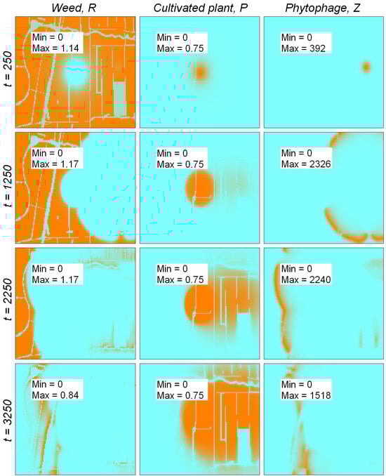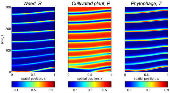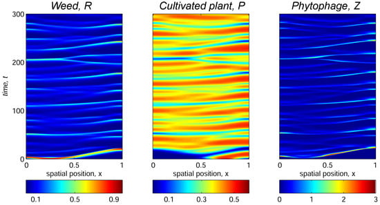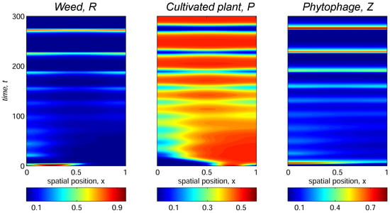 Aside from spatially heterogeneous dynamics of the weed–phytophage system (Figure 5) and stationary modes corresponding to exclusion of either cultivated plant or weed (Figure 4 and Figure 6), more complex dynamic spatiotemporal scenarios of all three species’ coexistence are possible. We illustrate this by varying the trophotaxis coefficient with Set 3 of the model parameter values presented in Table 1 and in the initial distribution of species (8). With these parameters, ignoring the trophotaxis behavior of phytophagous insects, i.e., setting , the model approaches spatially homogeneous periodicity in time dynamics, which corresponds to the stable limit cycle of coexistence of all three modeled species in the nonspatial system (7). This scenario is presented in Figure 7.