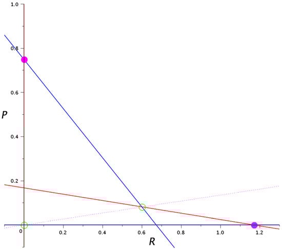 With the chosen parameters, depending on the initial condition, System (9) predicts competitive exclusion of one or another species, approaching either equilibrium or equilibrium , where and are the “carrying capacities” of the weed and cultivated plant, respectively (see Figure 10).