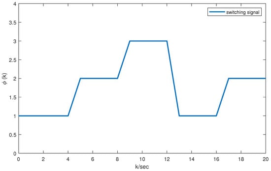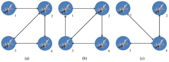 For illustrative purposes, Figure 2 shows a switching communication topology , and with four UAVs. Figure 3 displays the change in the switching signal . Then, from Figure 2, we can give the corresponding matrix :