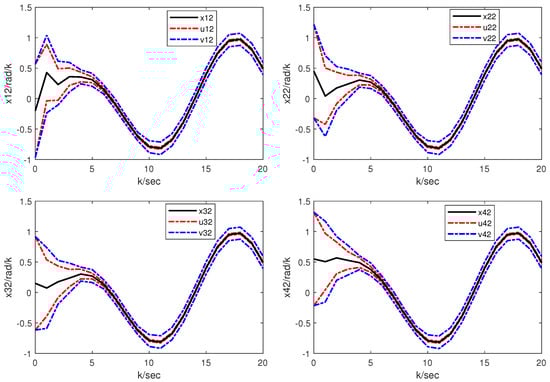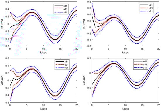It is evident that the states of CPS are completely surrounded by those of the upper and lower observers. From Figure 4, Figure 5 and Figure 6, it can be seen that the distributed interval observer designed in this paper has higher estimation accuracy compared to the traditional monotone system approach in []. We design the optimal robust observer using the technique, which reduces the design requirements of the observer, unlike the technique applied in []. Different from [] and most of the work, we consider for the first time the case of switching topology among distributed interval observers. Thus, the proposed distributed interval observers design method for CPSs is effective and feasible.
