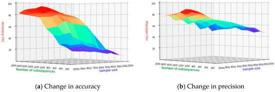 Figure 19a–d, respectively, show the changes of accuracy, precision, recall and F1 values under different numbers of subsequences and different sample sets, and the different colors in the figure represent the changes in performance indicators with different WINDOWS sizes. From the figure, it can be seen that the accuracy as a whole increases with the number of sample sets. It is on the rise, but at different stages of the number of sample sets, when the number of sequences is small, the accuracy is lower. When the number of sample sets reaches the maximum and the number of subsequences is 1200, the accuracy reaches the maximum. The reason for this phenomenon may be that when the number of subsequences is small, the malware detection model cannot collect enough information to distinguish malware. The precision as a whole increases with the increase in the number of sample sets, and the change is relatively stable. When the sample set reaches its maximum, subsequence precision peaks at 1200 sequences. Recall starts above 50% from the beginning and steadily increases with the growth of the sample sets. This trend indicates that the malware detection model tends to classify the software under detection as malware. The malware F1 of the detection model reaches the maximum when the number of sample sets reaches the maximum and the number of subsequences is 1200. In summary, the number of subsequences is 1200 in the current data set.