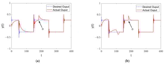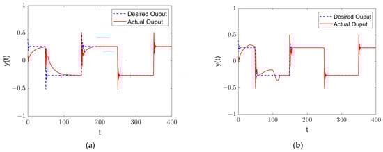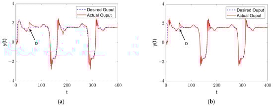 The compared simulated results for system (53) with disturbance. (a) Traditional NN PID scheme. (b) The proposed scheme.