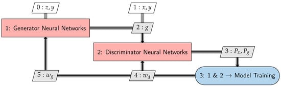 A GAN is in nature a type of generative model that consists of two neural networks: a generator and a discriminator (Figure 2) [35]. The generator initially produces random outputs based on random input variables, but as it receives feedback from the discriminator, it learns to generate more realistic samples through training. The discriminator, on the other hand, is trained on a data set of existing samples and the generated samples created by the generator. The discriminator is to distinguish between existing and generated data and provide feedback to the generator by assigning probabilities to the existing and generated samples, indicating how likely they are to be real. During the training process, the generator and the discriminator attempt to compete with each other in an adversarial manner. This competition drives the improvement of both models through the model training process. Thus, as the training proceeds, the generator is more capable of producing similar samples as existing data that the discriminator cannot differentiate.
