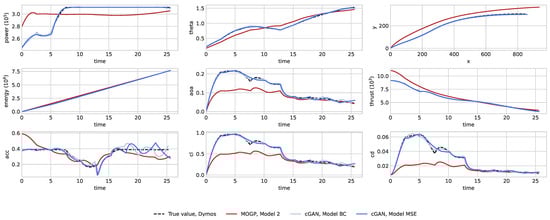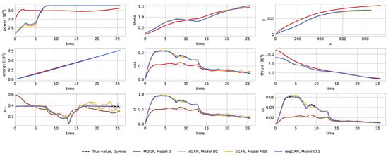 The predictive performance of the regGAN surrogates is compared against Dymos simulation-based optimal trajectory predictions as well as MOGP and cGAN surrogates. The same 1000 training samples and 300 testing samples are used for regGAN model training and verification, respectively. The architecture and the hyperparameters are introduced in Section 2.5.3. We first focus on the regGAN surrogate with a single MSE loss function by setting a zero weight on BC in the combined loss (CL1) (Table 8). The table shows that the regGAN CL1 model reaches 99.5% accuracy with robust predicted results, which can be recognized by the low standard deviation of testing accuracy. To further compare results, we implement regGAN on the same visualization case in Table 4. Table 9 shows that the regGAN has a mean testing accuracy of over 99.5% in the visualization case. Figure 8 shows that the optimal takeoff trajectory profiles predicted by regGAN match Dymos results closer than the cGAN model BC and MSE and MOGP model 2, as expected.