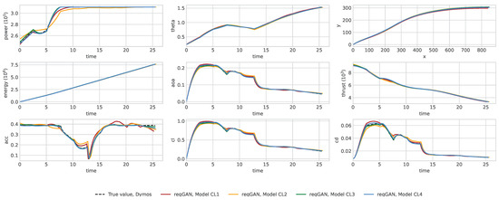 Optimal takeoff trajectory profiles predicted by regGAN models CL1–4 match well with simulation-based ground truth.