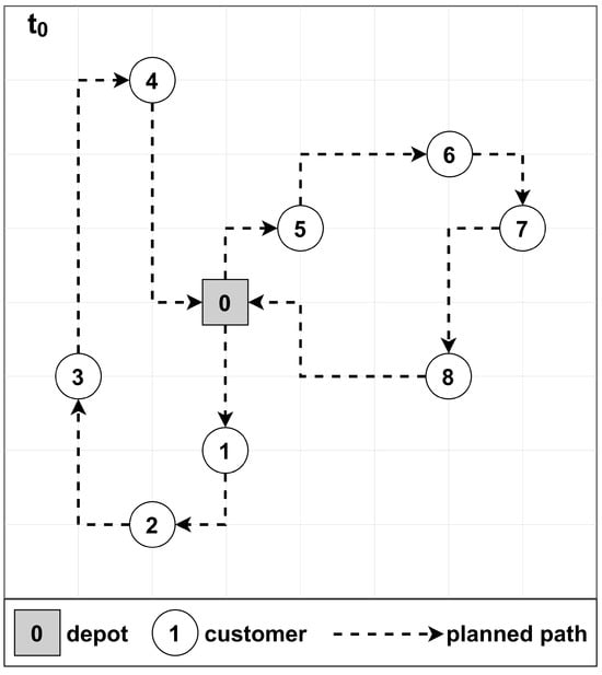 From an information perspective, VRPs involve the evolution and quality of information []. The evolution of information in VRPs refers to the changing nature (static or dynamic) of available information during route execution. This includes adapting to changes, such as incorporating new customer requests that arise after the vehicle has already left the depot. On the contrary, the latter refers to the degree of uncertainty (deterministic or stochastic) in the available data. This uncertainty highlights the potential variability in the accuracy and reliability of the information. For instance, a customer’s demand is known only as a range estimate rather than an exact value.