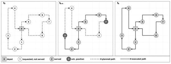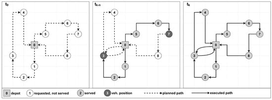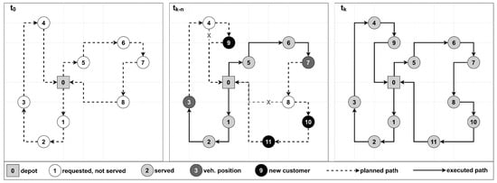 - Dynamic and deterministic: Some or all problem data are initially unavailable but gradually revealed during the planning and execution. There are no inherent uncertainties in the variables. For example, when a new dynamic event occurs, complete and fixed information about it becomes available at the time of the event. Figure 4 illustrates the planning and execution phases of a dynamic and deterministic VRP. The planning phase () involves generating a feasible solution to the known problem and the execution phase () allows for dynamic route adaptation to the changing conditions. New customer requests are revealed during execution and the DVRP accommodates their inclusion in the current routes, adhering to constraints. Dynamic adaptation aims to enhance fleet resource utilisation by promptly adjusting their plans to recent information.