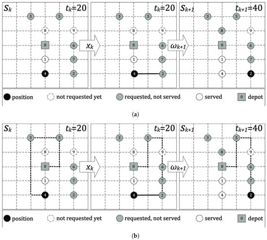 - Ulmer, M.W. Approximate Dynamic Programming for Dynamic Vehicle Routing; Number 978-1-4614-3628-7 in International Series in Operations Research and Management Science; Springer: Cham, Switzerland, 2017. [Google Scholar] [CrossRef]